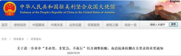 中國駐美國大使館12月19日發(fā)布通知,近期從美國輸入中國的新冠確診病例大量增加,經(jīng)查,多數(shù)確診病例與旅途中轉(zhuǎn)感染有關(guān),部分也與中介機(jī)構(gòu)、實(shí)驗(yàn)室存在違規(guī)操作以及檢測后不能遵守居家隔離要求有關(guān)。截至12月18 日,美國疾病控制與預(yù)防中心(CDC)統(tǒng)計(jì)的美國確診病例已近1700萬例,CDC并預(yù)計(jì)2021年1月初仍可能會有每周120萬至230萬例新增報(bào)告病例。為保護(hù)中外乘客和航空公司乘務(wù)人員健康和生命安全,筑牢外防輸入防線,根據(jù)國內(nèi)******要求,駐美國使領(lǐng)館現(xiàn)再次提醒大家慎重考慮疫情期間的感染風(fēng)險(xiǎn),務(wù)必牢記“非必要,非緊急,不旅行”。同時,對確有緊急旅行需要的乘客進(jìn)行新冠病毒核酸檢測、血清抗體檢測相關(guān)要求作出進(jìn)一步規(guī)范和說明: